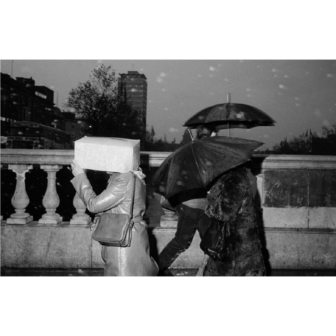 The idea for Bad Weather was born from Martin Parr’s desire to make a body of work that focused on a British obsession. The weather seemed like an ideal subject. In this black-and-white series, shot with a waterproof camera and flash and published in 1982, Parr captures everyday moments of his fellow citizens dealing with typical British weather conditions: showers, drizzle, snowstorms. “Usually you’re told to only take photographs when the light is good and the sun is shining,” Parr says, “and I liked the idea of only taking photographs in bad weather, as a way of subverting the traditional rules.”